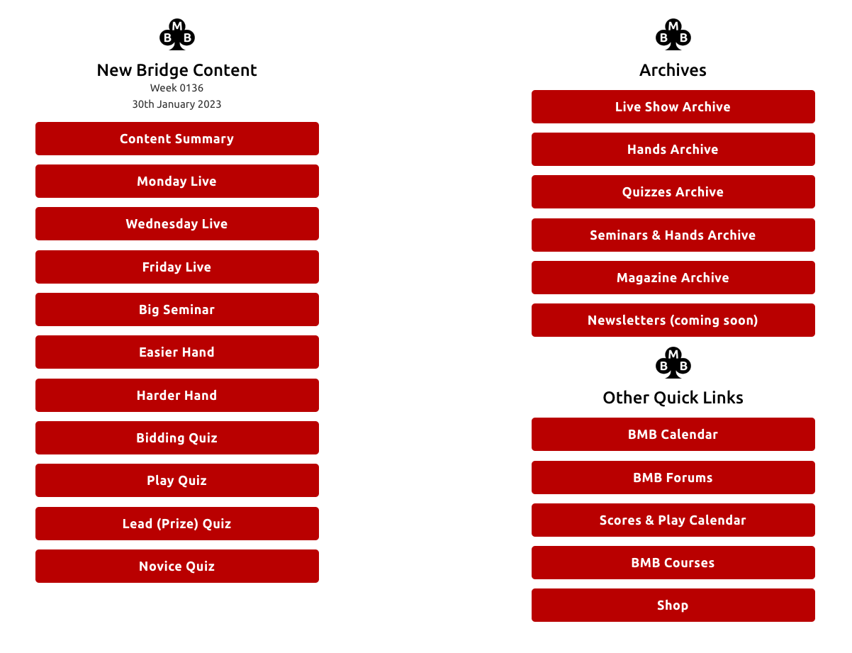 **‘Bridge Content’** brings up a **menu page** with **red buttons** for **quick links** to all the **new and archive** bridge **content** as well as **quick links** to access **other areas** on the site: